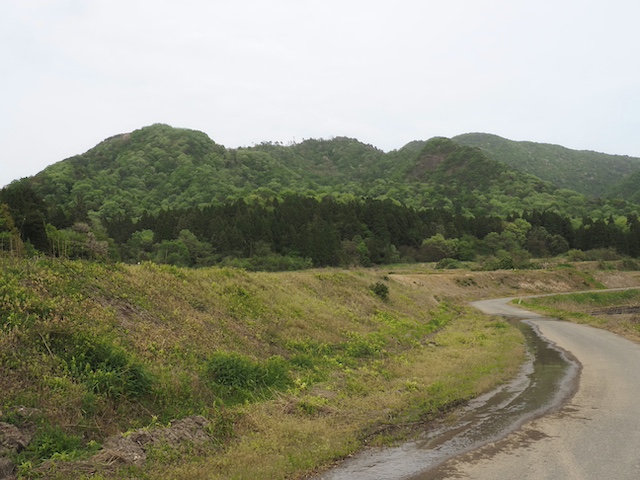 鳥坂城のあったと思われる山のいただき、遠望。ひっきりなしに鳥の声がします。こんなのどかな季節に戦が行われたのです。今は静かに見えるこの山の上に、かつてたくさんの人々が活動して、栄枯盛衰のドラマがあったと思うと、不思議な感慨を覚えます。