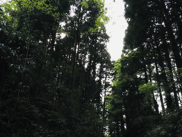 鬱蒼とした山道、大きな木々です。山の匂いがします。