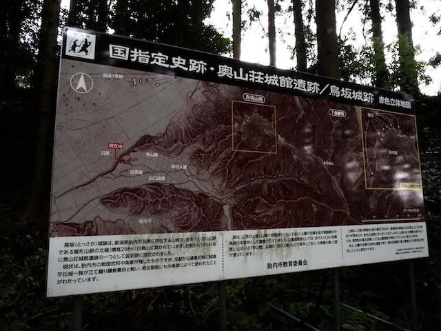山道横に設置された看板、予想をはるかに超える広さで、鳥坂城と板額御前の一族、城(じょう)氏の領地「奥山荘」が地図上に示されています。