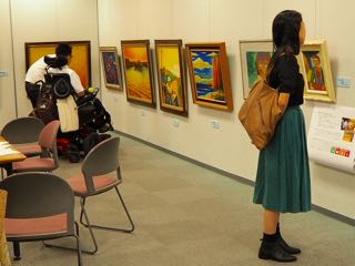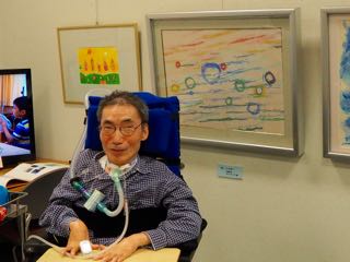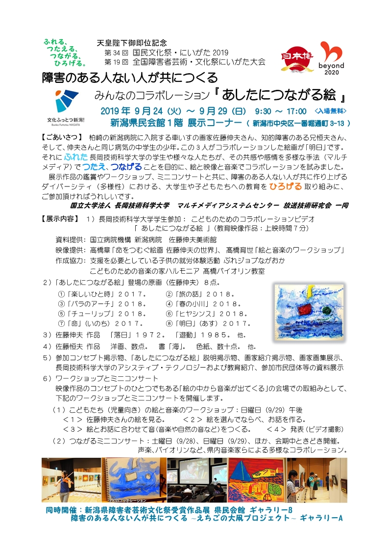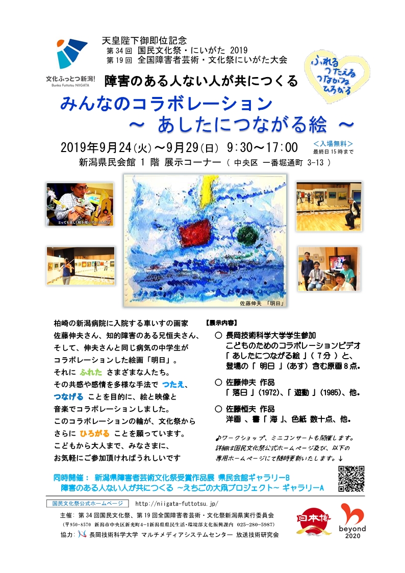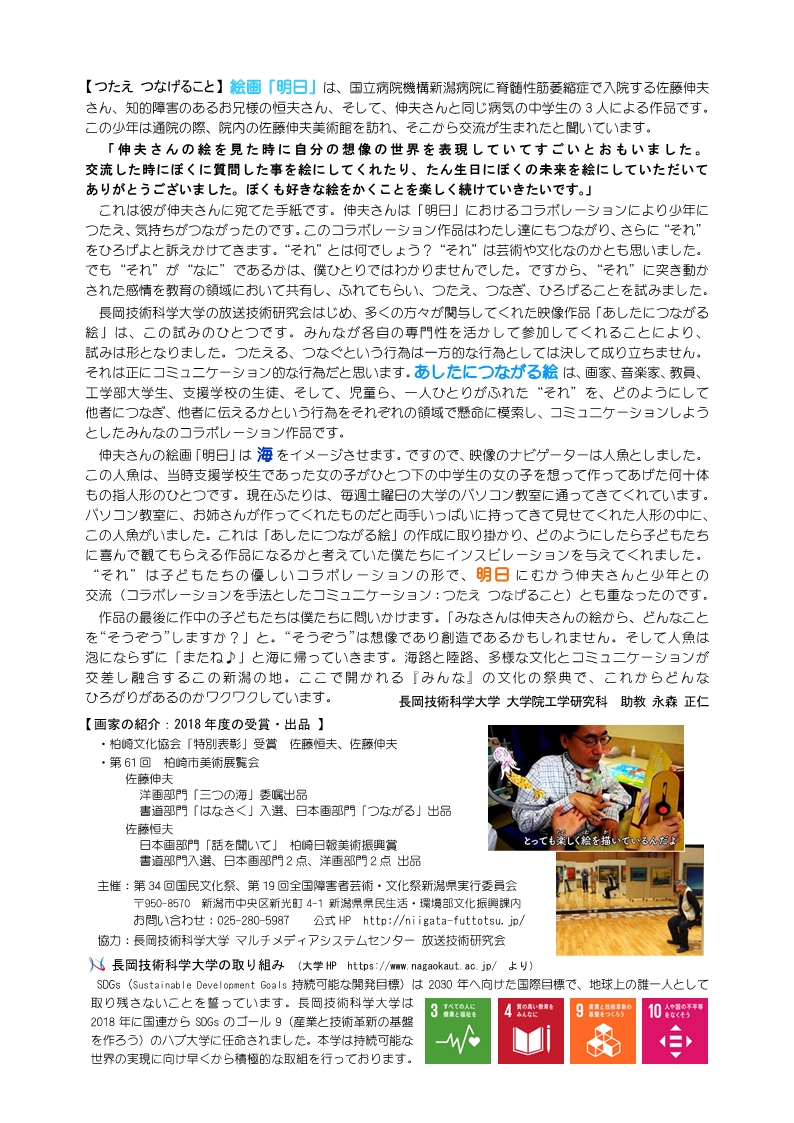 車いすの画家佐藤伸夫さんのアイディアで、お兄さんの恒夫さん、伸夫さんと同じ病気の中学生、の三人のコラボレーションで描かれた絵が「明日」です。